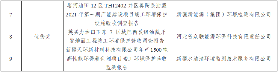 2023年全區(qū)優(yōu)秀建設(shè)項(xiàng)目環(huán)境保護(hù)竣工驗(yàn)收報(bào)告書評選活動已結(jié)束。按照《關(guān)于開展2023年全區(qū)優(yōu)秀建設(shè)項(xiàng)目環(huán)境保護(hù)竣工驗(yàn)收報(bào)告書評選工作的通知》(新環(huán)協(xié)發(fā)〔2023〕28號)》的要求,本次評審經(jīng)過個人申報(bào)、單位推薦、形式審查、專家評審、綜合評定等環(huán)節(jié),共評選出9本獲獎報(bào)告書,現(xiàn)將名單予以公示,公示期為2023年9月18日至2023年9月26日。