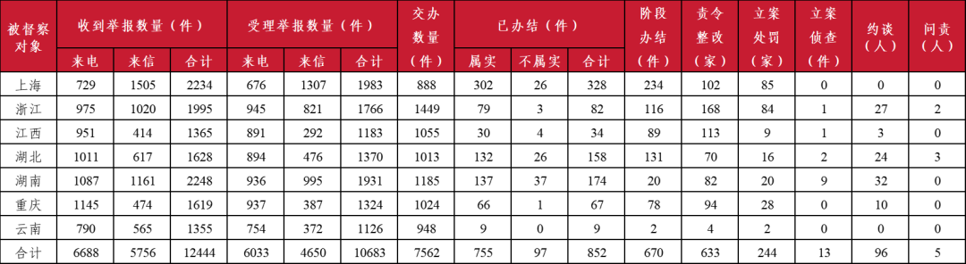 截至5月20日晚20:00,各督察組共收到群眾來電、來信舉報12444件,受理有效舉報10683件,經(jīng)梳理合并重復舉報,累計向被督察地方轉(zhuǎn)辦7562件;被督察地方已辦結(jié)或階段辦結(jié)1522件,其中立案處罰244家;立案偵查13件;約談黨政領(lǐng)導干部96人,問責黨政領(lǐng)導干部5人。