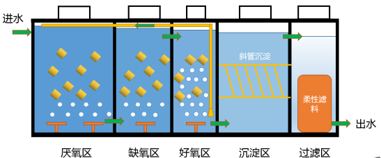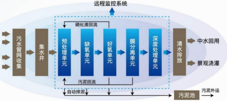 (4)模塊化集成系統(tǒng):根據(jù)區(qū)域水質(zhì)、氣候特點(diǎn);將預(yù)處理,同步硝化反硝化工藝、泥水分離、消毒等處理單元優(yōu)化配置與工藝集成,使處理裝置結(jié)構(gòu)緊湊、高效、出水穩(wěn)定。
