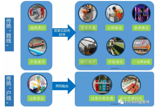 對(duì)于環(huán)衛(wèi)鏈,E20進(jìn)一步細(xì)分為路線、戶線和庫(kù)線三種傳統(tǒng)環(huán)衛(wèi)的收運(yùn)線路,其中,“路線”是指道路清掃,包括市政道路和水面(主要在南方地區(qū));“戶線”是指小區(qū)及部分單位生活垃圾的收集清運(yùn);“庫(kù)線”是指產(chǎn)生特殊運(yùn)營(yíng)單位的垃圾,如醫(yī)療垃圾、餐廚垃圾、建筑垃圾等,由處置單位直接負(fù)責(zé)收運(yùn)或向社會(huì)類運(yùn)輸單位進(jìn)行購(gòu)買的一種收運(yùn)方式。傳統(tǒng)環(huán)衛(wèi)當(dāng)中,“路線”和“戶線”是主要類型,且其服務(wù)內(nèi)容在不斷橫向外延拓展中,如前者在某些項(xiàng)目中增加了管道疏通、公廁保潔、景觀亮化、路等維護(hù)、市政綠化等內(nèi)容;后者增加了垃圾分類、再生資源利用等內(nèi)容。在環(huán)衛(wèi)鏈上的內(nèi)容創(chuàng)新、模式創(chuàng)新,是環(huán)衛(wèi)PPP項(xiàng)目設(shè)計(jì)及有效落地的重點(diǎn)。