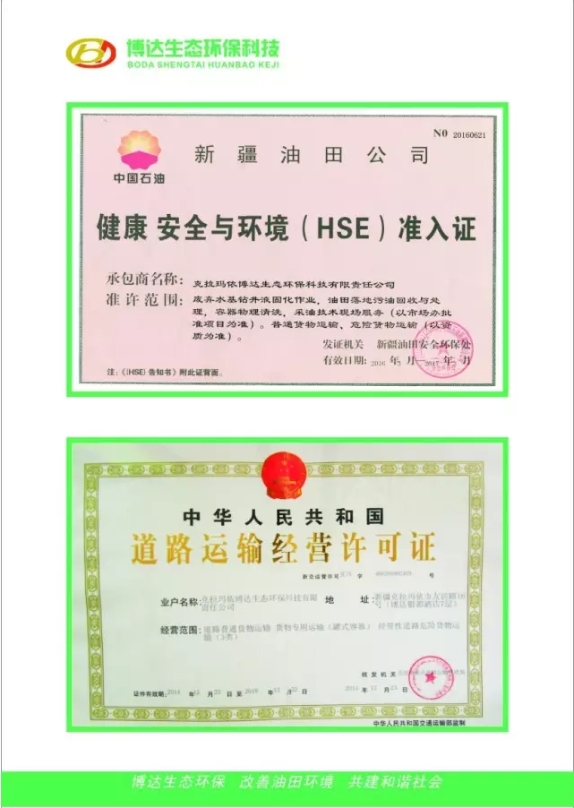 公司現(xiàn)持有自治區(qū)安全生產(chǎn)監(jiān)督管理局頒發(fā)的《安全生產(chǎn)許可證》;自治區(qū)環(huán)保廳頒發(fā)的《危險廢物經(jīng)營許可證》;自治區(qū)安科院頒發(fā)的《危險化學品登記證》;克拉瑪依市運管局頒發(fā)的《道路運輸經(jīng)營許可證》。