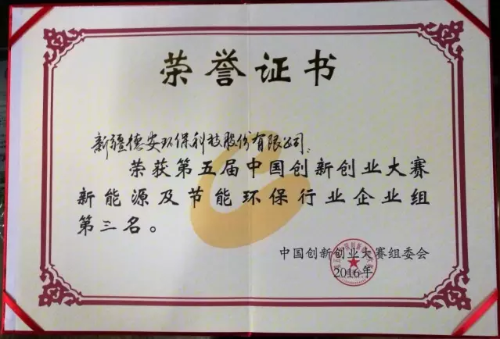 第五屆中國創(chuàng)新創(chuàng)業(yè)大賽新能源及節(jié)能環(huán)保行業(yè)全國總決賽企業(yè)組第三名(本屆大賽新疆最好成績,環(huán)保行業(yè)歷史最好成績)