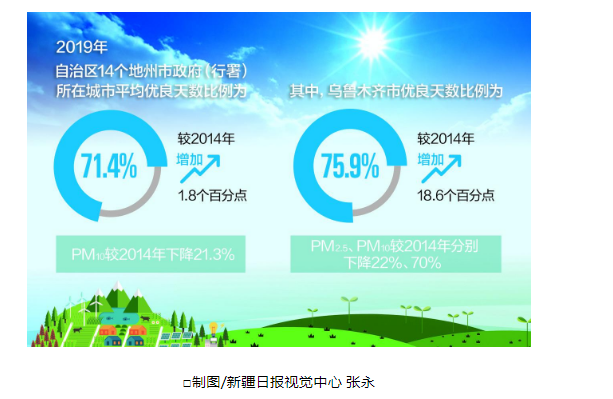 數(shù)據(jù)顯示,2019年,自治區(qū)14個地州市政府(行署)所在城市平均優(yōu)良天數(shù)比例為71.4%,較2014年增加1.8個百分點,PM10較2014年下降21.3%。其中,烏魯木齊市優(yōu)良天數(shù)比例為75.9%,較2014年的57.3%增加18.6個百分點,重污染天數(shù)比例為6.3%,較2014年減少0.5個百分點,PM2.5、PM10較2014年分別下降22%、70%。