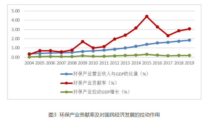 2004—2019年,我國(guó)環(huán)保產(chǎn)業(yè)營(yíng)業(yè)收入與國(guó)內(nèi)生產(chǎn)總值(GDP)的比值從2004年的0.4%逐步擴(kuò)大到2019年的1.8%。環(huán)保產(chǎn)業(yè)對(duì)國(guó)民經(jīng)濟(jì)直接貢獻(xiàn)率從2004年的0.3%上升到2019年的3.1%,盡管期間出現(xiàn)過(guò)一些波動(dòng),但環(huán)保產(chǎn)業(yè)對(duì)國(guó)民經(jīng)濟(jì)的貢獻(xiàn)總體呈逐步加大的趨勢(shì)。