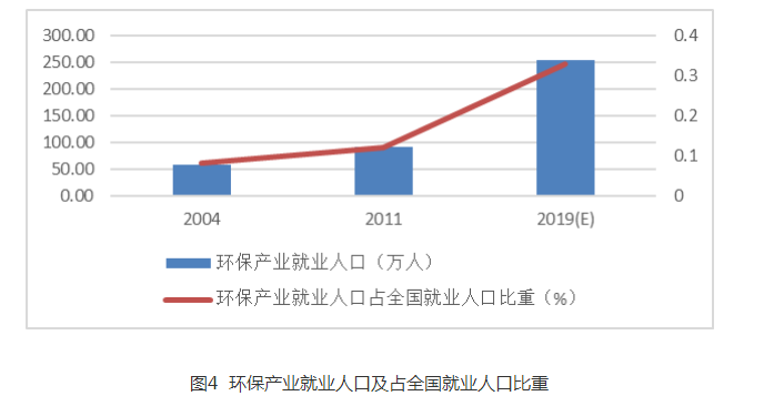 2004-2011年,我國(guó)環(huán)保產(chǎn)業(yè)從業(yè)人員年均增長(zhǎng)率6.8%,2011-2019年年均增長(zhǎng)率為13.6%。2019年環(huán)保產(chǎn)業(yè)從業(yè)人員占全國(guó)就業(yè)人員年末人數(shù)的0.33%,比2011年提高0.21個(gè)百分點(diǎn),比2004年提高0.25個(gè)百分點(diǎn),對(duì)全國(guó)就業(yè)的貢獻(xiàn)呈逐步擴(kuò)大的趨勢(shì)。