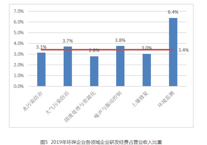 2019年,被調(diào)查企業(yè)研發(fā)經(jīng)費(fèi)支出占營(yíng)業(yè)收入的比重為3.4%,明顯高于2018年全國(guó)規(guī)模以上工業(yè)企業(yè)研發(fā)經(jīng)費(fèi)支出占營(yíng)業(yè)收入的比重(1.2%)。與2018年相比,2019年環(huán)保企業(yè)平均研發(fā)經(jīng)費(fèi)支出同比增長(zhǎng)15.6%。各細(xì)分領(lǐng)域均有所提高,其中,固廢處理處置與資源化、土壤修復(fù)、環(huán)境監(jiān)測(cè)領(lǐng)域增幅均在20.0%左右。