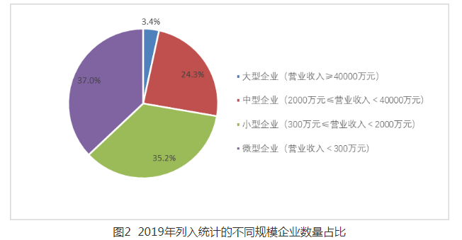 從企業(yè)規(guī)???,列入統(tǒng)計(jì)范圍的環(huán)保企業(yè),大、中型企業(yè)數(shù)量占比分別為3.4%、24.3%;小、微型企業(yè)數(shù)量占比為72.2%。其中,營(yíng)業(yè)收入在1億元以上的企業(yè),以9.8%的企業(yè)數(shù)量占比(較上年降低了0.6個(gè)百分點(diǎn)),貢獻(xiàn)了超過(guò)92%的營(yíng)業(yè)收入和利潤(rùn)。