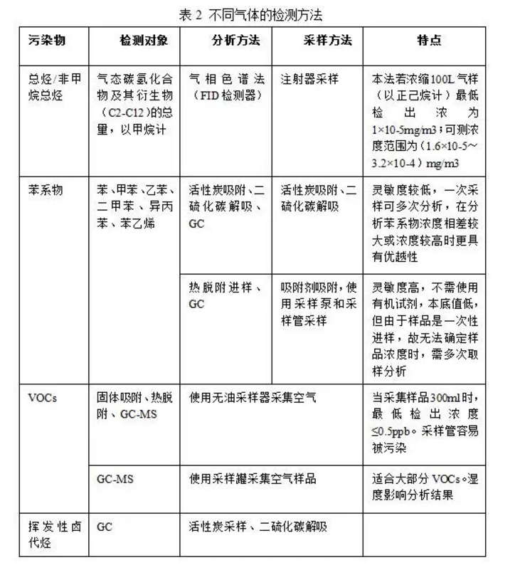 在線監(jiān)測常常使用PID或FID手段,但第三方檢測時(shí)常采用一些物理或化學(xué)的方法進(jìn)行檢測。常用有機(jī)化合物的評價(jià)方法如表2所示: