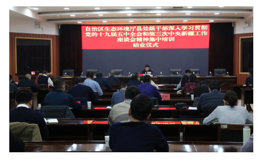 12月11日至18日,自治區(qū)生態(tài)環(huán)境廳組織開展縣處級(jí)干部十九屆五中全會(huì)和第三次中央新疆工作座談會(huì)精神集中培訓(xùn)班。廳黨組書記戴武軍同志作動(dòng)員講話,廳黨組副書記、廳長(zhǎng)哈爾肯·哈布德克里木同志主持開班儀式。