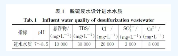 脫硫廢水近零排放系統(tǒng)設(shè)計(jì)廢水處理量為33m3/h,其中一期脫硫廢水排放量約為8m3/h,一期脫硫廢水經(jīng)過現(xiàn)有處理系統(tǒng)后,排入后期深度處理系統(tǒng)。二期脫硫廢水設(shè)計(jì)排放量為25m3/h,二期為新建系統(tǒng)。設(shè)計(jì)廢水水質(zhì)見表1。