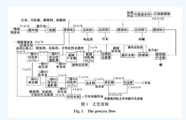 針對脫硫廢水水質(zhì)特點(diǎn),選擇預(yù)處理-超濾-反滲透-蒸發(fā)結(jié)晶器組合工藝,使?jié)恹}水減量,并能分鹽結(jié)晶,既降低了蒸發(fā)結(jié)晶的規(guī)模節(jié)省了投資成本,又減少了運(yùn)行費(fèi)用。