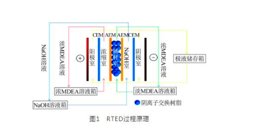 Fuqiang CHEN等采用自行設(shè)計(jì)的陰離子交換樹(shù)脂耦合三室電滲析(RTED)去除裝置(圖1)對(duì)N-甲基二乙醇胺(MDEA)廢水進(jìn)行處理,廢水中熱穩(wěn)定鹽(Heat Stable Salts,HSS)的去除率約為93.84%,比傳統(tǒng)三室ED高7.88%,比傳統(tǒng)二室ED高28.57%,且RTED的MDEA損失率很低。由于在稀釋室填充陰離子交換樹(shù)脂,RTED造成的膜污染也很少。
