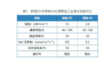 Qingbai CHEN等通過(guò)改變膜堆結(jié)構(gòu)(樹(shù)脂填充電極電池和不對(duì)稱膜對(duì)設(shè)計(jì))并且優(yōu)化流入模式(電解質(zhì)平行流動(dòng)和稀釋/濃縮逆流),降低了ED脫鹽過(guò)程的能耗。該新型ED與傳統(tǒng)ED對(duì)高鹽工業(yè)廢水進(jìn)行脫鹽的性能對(duì)比見(jiàn)表1。