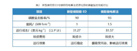 Yuyan CAI等提出了一種新型鎂陽(yáng)極ED,陽(yáng)極氧化產(chǎn)生的鎂離子與高鹽工業(yè)廢水中的磷酸鹽和氨氮反應(yīng)生成鳥(niǎo)糞石沉淀,以實(shí)現(xiàn)資源化利用。新型鎂陽(yáng)極ED與鎂陽(yáng)極電解法從高鹽工業(yè)廢水中資源化回收磷酸鹽效能對(duì)比見(jiàn)表2。