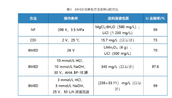 S. BUNANI等使用均相離子交換膜通過(guò)BMED法從水溶液中同時(shí)分離和回收B和Li,在外加電壓15 V和初始樣品體積0.5 L的最佳條件下,Li的分離回收率分別為99.6%和88.3%,B的分離率和回收率分別為72.3%和70.8%,這表明,在Li去除與回收方面BMED大有前景。BMED與其他方法在Li去除方面的效果對(duì)比見(jiàn)表3。