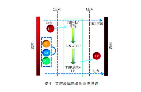 Zhongwei ZHAO等設(shè)計(jì)出一種結(jié)合液膜萃?。↙iquid Membrane Permeation,LMP)和ED特點(diǎn)的夾層液膜電滲析系統(tǒng),其原理見(jiàn)圖4,夾層液膜由2個(gè)CEM和1個(gè)負(fù)載Li+的有機(jī)液膜組成,其中有機(jī)液膜優(yōu)選為磷酸三丁酯(TBP)+ClO4-體系,這種夾層液膜電滲析法實(shí)現(xiàn)了從高M(jìn)g、Li質(zhì)量比鹽湖鹵水中選擇性回收Li。