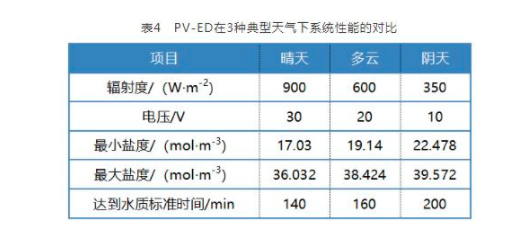 Haiyang XU等提出了一種小型光伏直接驅(qū)動(dòng)電滲析系統(tǒng),探討了3種典型天氣對(duì)系統(tǒng)性能的影響,見(jiàn)表4,光伏組件提供的電壓受天氣影響,隨著輻射度的減小而減小,由此導(dǎo)致電場(chǎng)驅(qū)動(dòng)力減小,出水達(dá)到水質(zhì)標(biāo)準(zhǔn)的時(shí)間變長(zhǎng)。
