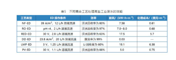 由于高鹽工業(yè)廢水中離子種類較多,ED與不同工藝耦合已成為研究熱點(diǎn)之一。結(jié)合實(shí)際情況,ED與不同工藝進(jìn)行耦合,在保證淡水回收率和資源回收率的同時(shí),廢水處理成本也有所下降。部分耦合工藝處理高鹽工業(yè)廢水的效能對(duì)比見(jiàn)表5。