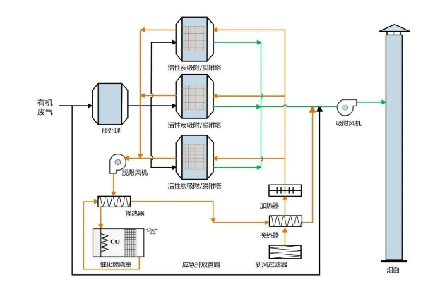 活性炭催化燃燒組合工藝,采用熱空氣進行脫附,雖然是最為常見的VOCs治理工藝,其實際效果并不理想。氣源的組分、濃度,安全性、脫附效率等都影響實際效果,在實際工程中很多活性炭催化燃燒改造系統(tǒng),此處不做贅述。